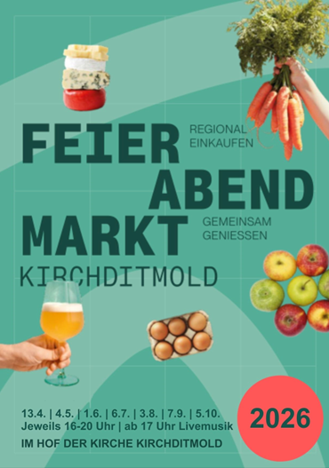 Am 13.04.2026 von 16 bis 20 Uhr findet wieder der Kirchditmolder Feierabendmarkt im Hof der Kirche Kirchditmold statt.