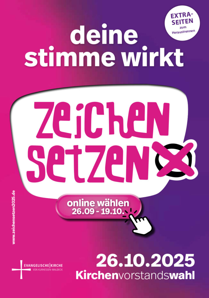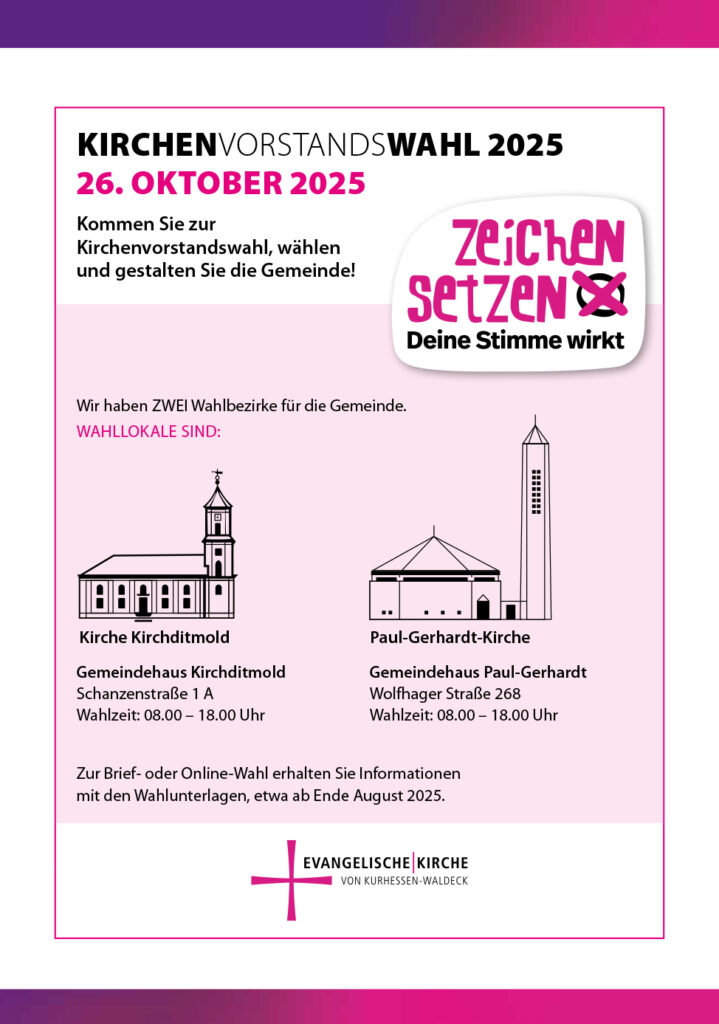 Onlinewahl: Statt der Stimmabgabe am Wahltag oder per Briefwahl können Sie bis zum 19. Oktober 2025 im Internet ebenfalls an der KV-Wahl teilnehmen. Auf Ihrer Wahlbenachrichtigung, die Sie in diesen Tagen erhalten, finden Sie die Zugangsadresse. Alle wahlberechtigten Gemeindemitglieder werden hiermit zur Teilnahme an der Wahl aufgefordert.