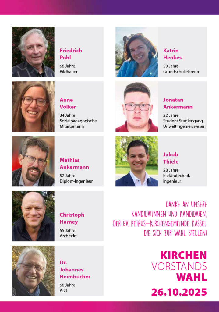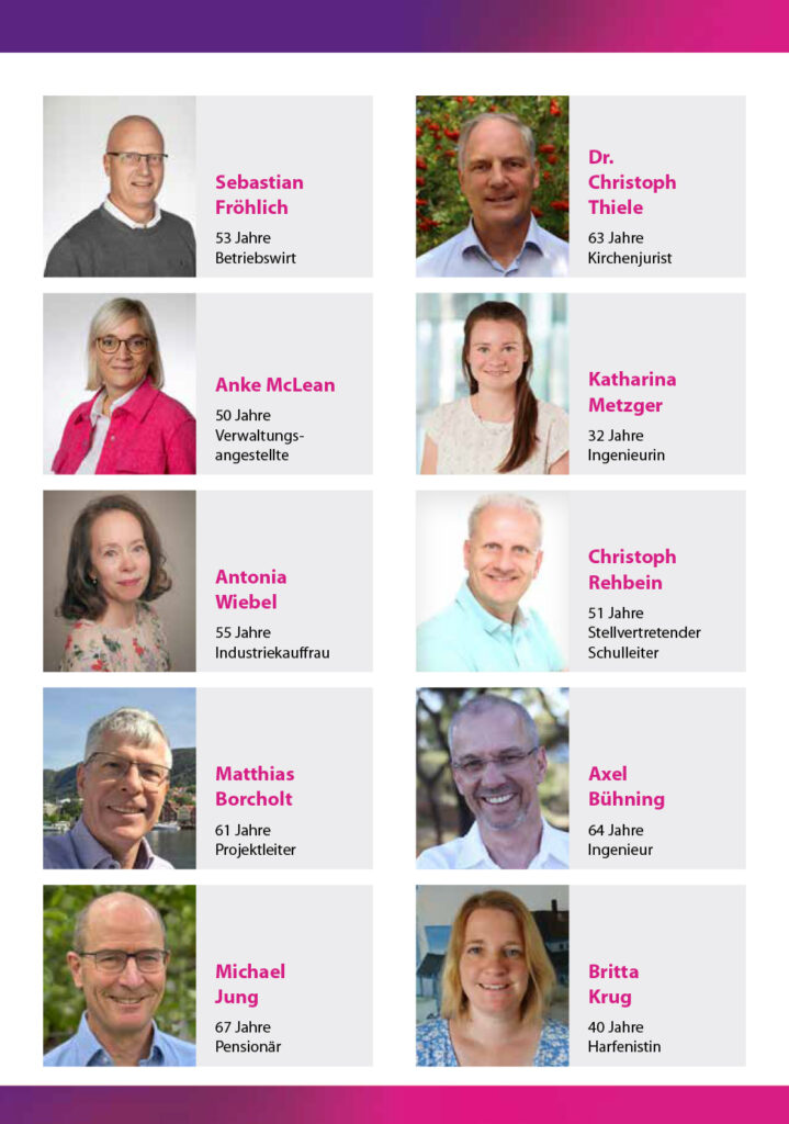 Bei dieser Gelegenheit danken wir allen, die sich als Kandidatinnen und Kandidaten zur Verfügung stellen. Hierdurch zeigen Sie Ihre Bereitschaft, sich für andere Menschen in der Gemeinde einzusetzen und sich in unserer Kirche um Christi willen zu engagieren.